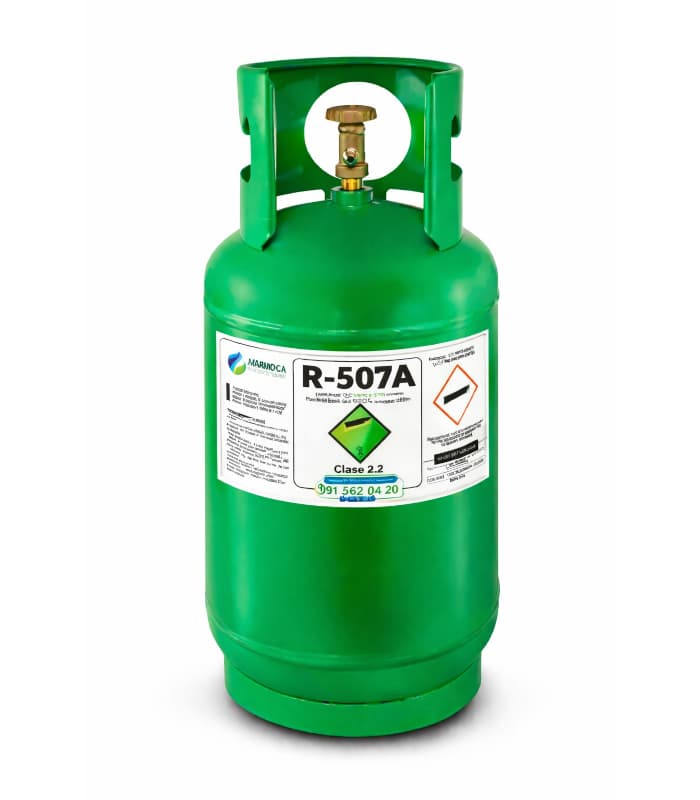 El R507A es una mezcla azeotrópica de hidrofluorocarbonos (HFC) compuesta por R-125 y R-143a en proporción 50/50. Desarrollado específicamente como sustituto del R-502 y el R-22 en aplicaciones de baja y media temperatura, el R507A ofrece un comportamiento termodinámico prácticamente idéntico al R-502 pero sin el impacto en la capa de ozono. En Gases Marmoca SL distribuimos R507A con pureza ≥99.5%, garantizando rendimiento óptimo en sistemas de refrigeración exigentes y cumplimiento integral de la normativa F-Gas europea.